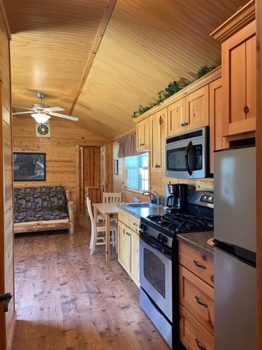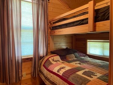 There’s no easier way to get back to nature without giving up everyday conveniences of home. This cabin has one bedroom with a queen size bed and another with bunk beds for adults or children. The warm, rustic style makes it easy to unwind, and climate control with heat and air conditioning, means you’ll be comfortable in this Fork Creek Cabin any time of year.